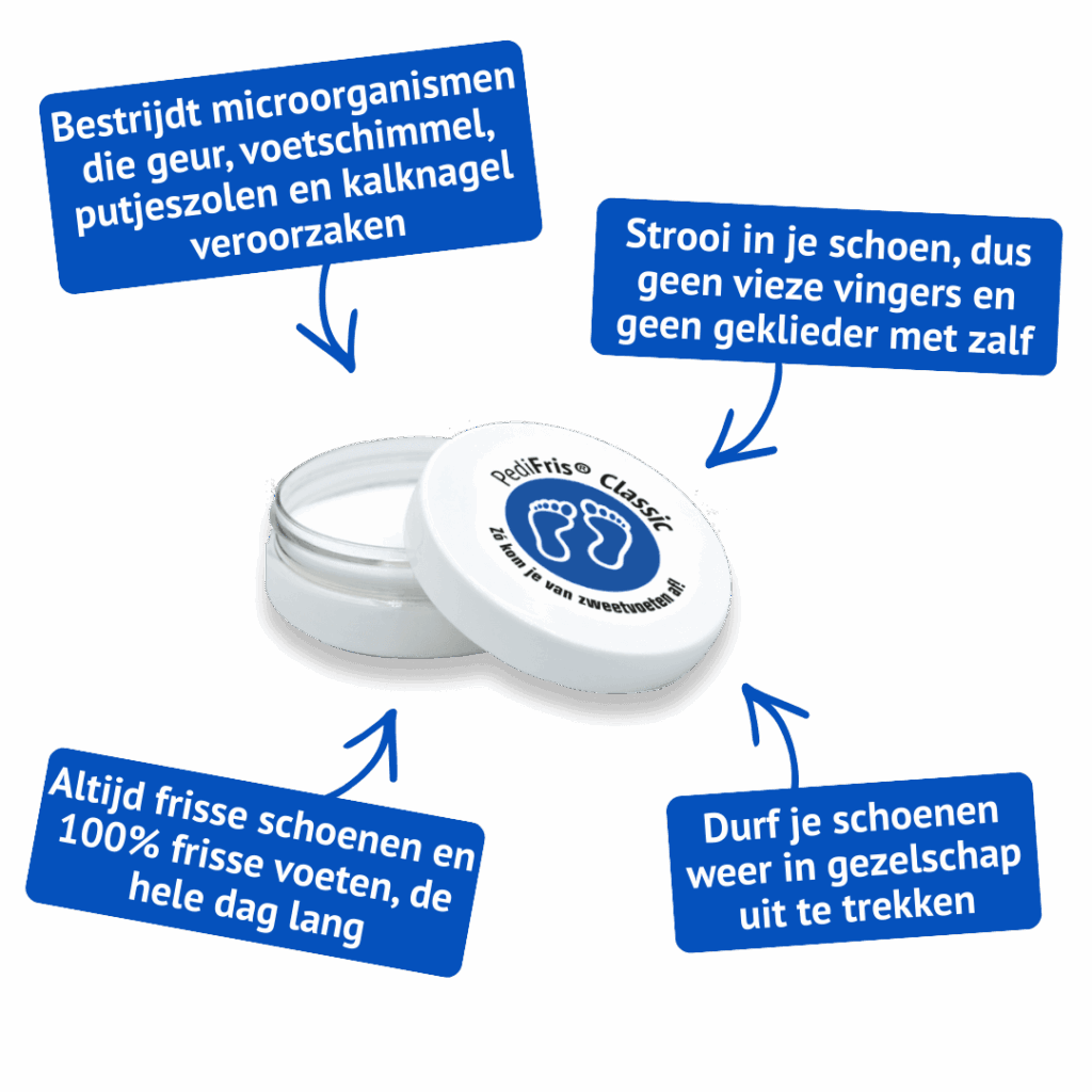 Per un approccio davvero completo al problema dei piedi sudati e ai problemi che ne derivano, combina PediSpray® con il talco per scarpe PediFris® Classic. Mentre PediSpray® mantiene i piedi asciutti e freschi, PediFris® Classic agisce specificamente sui batteri e sui funghi che si annidano nelle scarpe e ne causano l'odore.