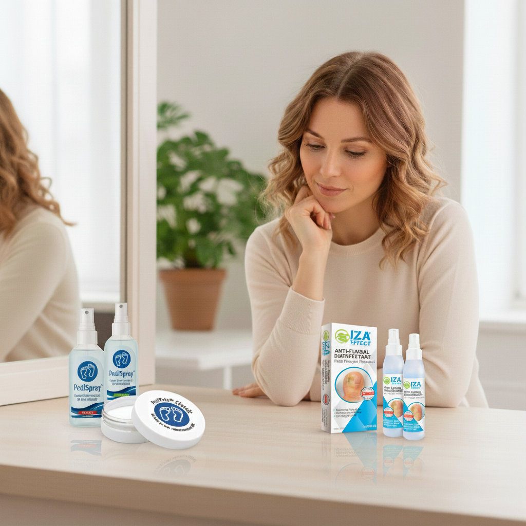 IZA Effect vs PediSpray: beide producten worden vaak genoemd bij dezelfde klachten. Onze insteek is praktisch: PediSpray heeft naast zweetcontrole ook een duidelijke desinfecterende werking (vergelijkbaar met het effect dat men bij IZA zoekt), en PediFris Classic desinfecteert zowel voet als schoen en helpt zo bij geur, schimmel en kalknagel in de dagelijkse routine.